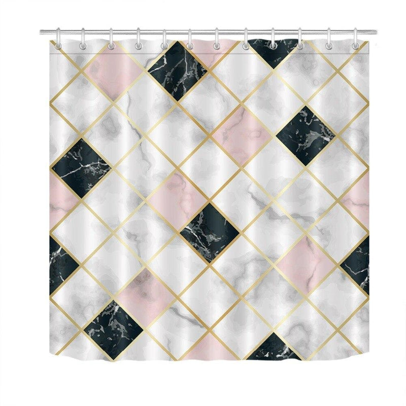 Trænger dit badeværelse til et frisk pust? Forestil dig at træde ind i et rum, der oser af modernitet og elegance hver dag. Dette badeforhæng med grafisk flisemønster design er ikke bare en praktisk genstand; det er et designstatement, der forvandler dit badeværelse til en lille oase. Med sit unikke mønster af skaktern i hvidt, lyserødt og sort marmorlook, indrammet af gyldne linjer, tilføjer det et sofistikeret touch, der vil imponere enhver gæst. Glem alt om kedelige badeforhæng – dette er design, der taler til din sans for stil.