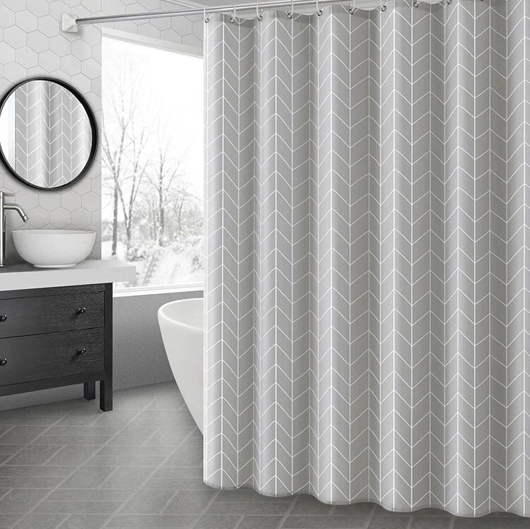 Gråt badeforhæng med hvidt sildebensmønster: Giv dit badeværelse et friskt pust